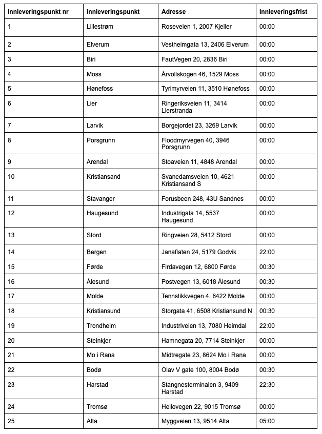 Aviser må være avlevert til Aktiv Norgesdistribusjon på ett av innleveringspunktene nedenfor innenfor frist.